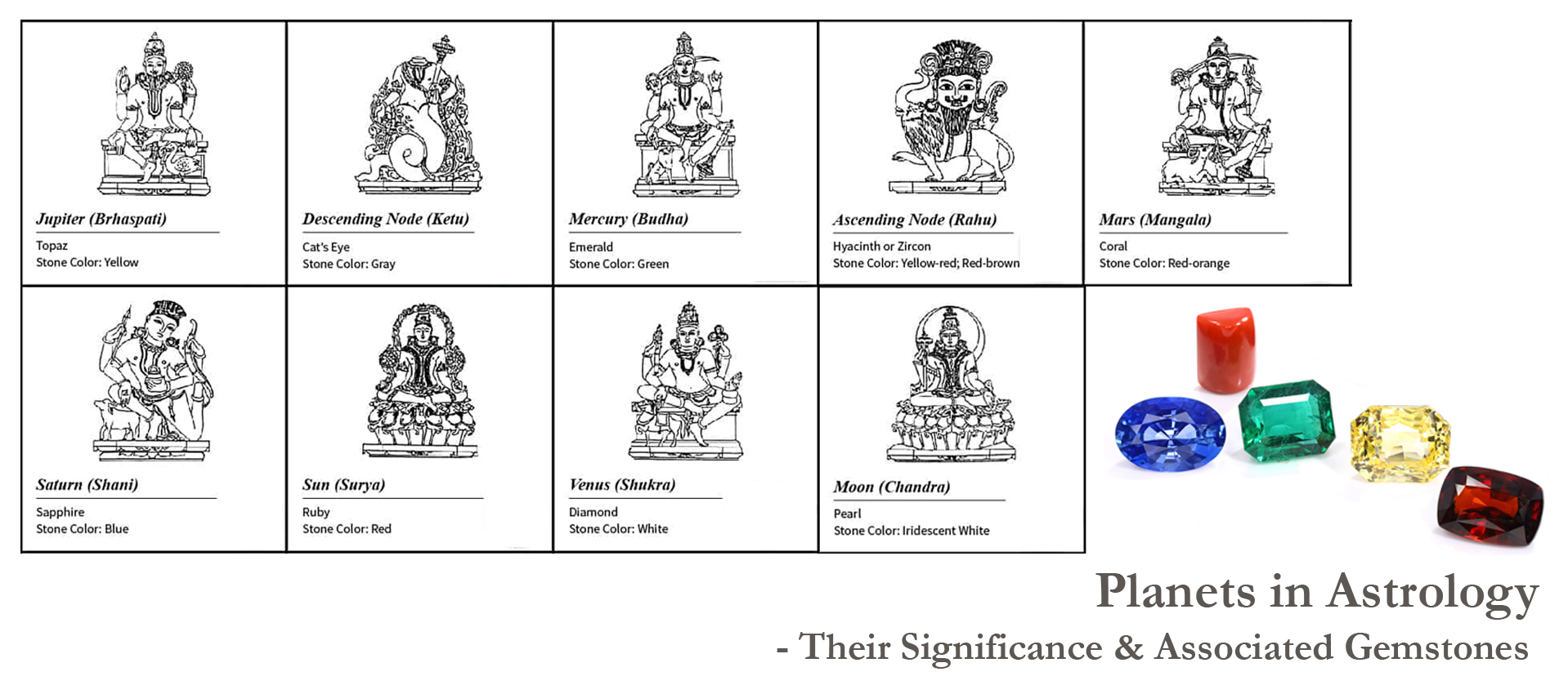 Navagraha gemstones as per astrology are Nine gemstones that are associated with and ruled by the Nine Grahs or astrological planets. These Navgrah gems are the most powerful stones in the world, with immense powers and healing properties. Each Navgraha or also called Nabgraha gems have an impact on an aspect of one’s life. As per the position of the planets in your birth chart, according to your birth time and place, it could be told which planet is in your favour and which one is weak or negatively placed. In this blog, we will discuss these Navgrahs and the gemstones associated and how they can better your life.Navagraha Gemstones and its SignificanceWhat are the stones in Navagraha? Which are the 9 Navratna stones?The Nabgraha gems include - Ruby stone, Emerald, Diamond, Blue Sapphire stone, Yellow Sapphire, Red Coral, Hessonite, Cat’s Eye and Pearl.These are the Navagraha stones names - the stones of Navgrahs. Now let's discuss which of these 9 Navratna stones is in association with which grah or planet:Which gemstone is for which planet?Ruby - Sun or Surya Grah Emerald - Mercury (Budh Grah)Diamond - Venus (Sukr)Blue Sapphire - Saturn (Shani)Yellow Sapphire - Jupiter (Brahaspati)Red Coral - Mars or Mangal Hessonite - Rahu Cat’s Eye - Ketu Pearl - Moon (Chandra Grah)Also Read - How Astrology And Gemstones Can Change Your Life?...