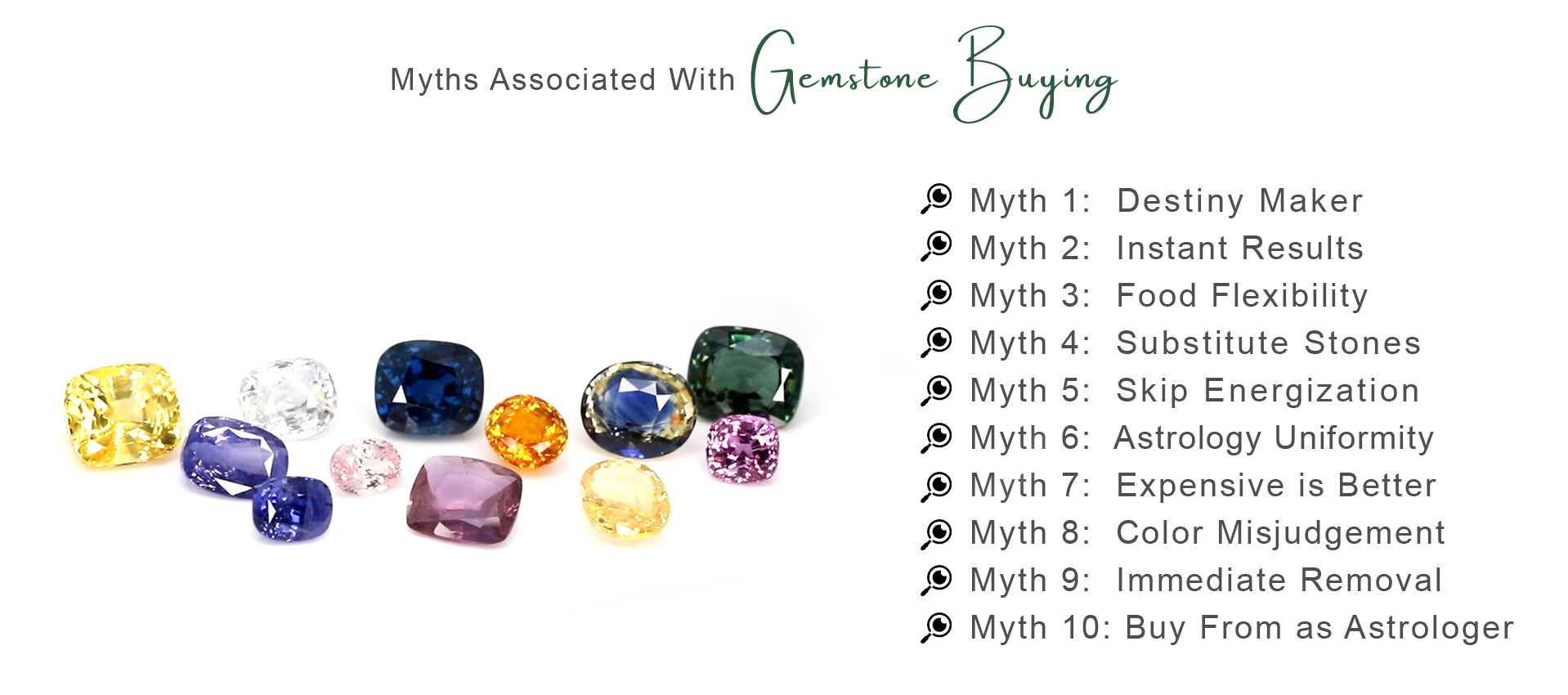 Myth 1: Buy Gemstones from an Astrologer It is a myth that one should buy a gemstone from an astrologer only. Gemstone dealers are the right person one should check out when purchasing authentic gemstones for jewellery or astrological purposes. Astrologers are the people who suggest stones after analyzing your birth chart. They tell you the right gem that will suit you and align with your chart to bring specific benefits. However, they may not be experts in gemology or market pricing....
