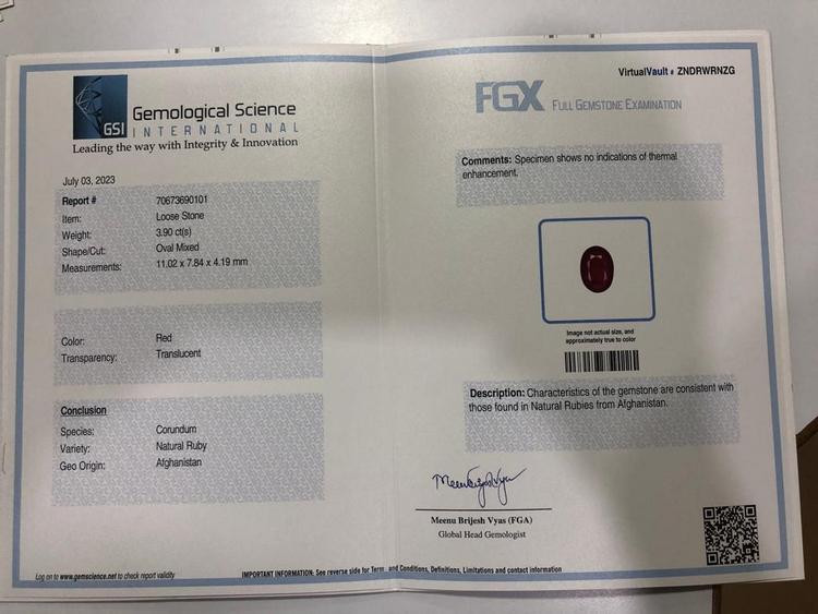 Original Natural Ruby weighing 3.9 Carat (4.33 ratti) From Afghanistan GSI lab certified