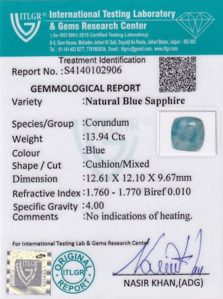 Original Natural Blue Sapphire Weighing 13.94 Carat (15.49 Ratti) From Burma ITLGR Lab Certified