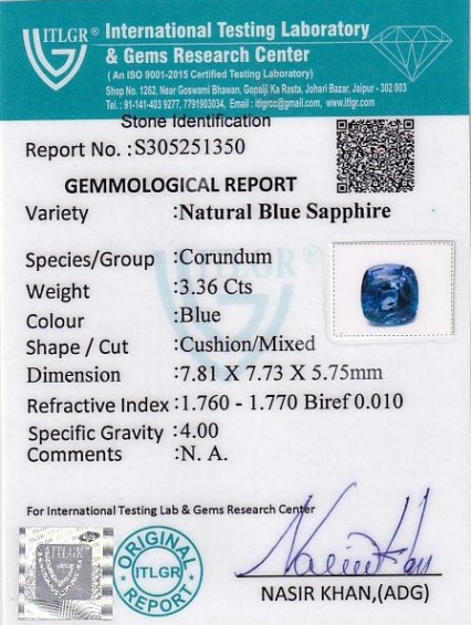 Original Natural Blue Sapphire weighing 3.36 Carat (3.73 ratti) From Sri Lanka (Ceylon) ITLGR lab certified