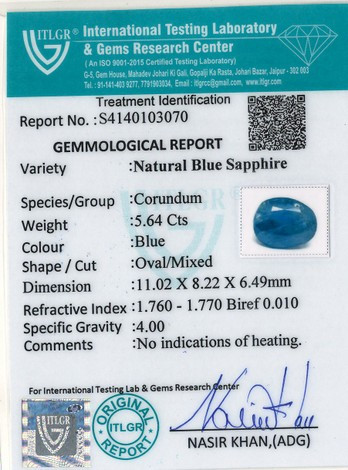 Original Natural Blue Sapphire Weighing 5.64 Carat (6.27 Ratti) ITLGR Lab Certified