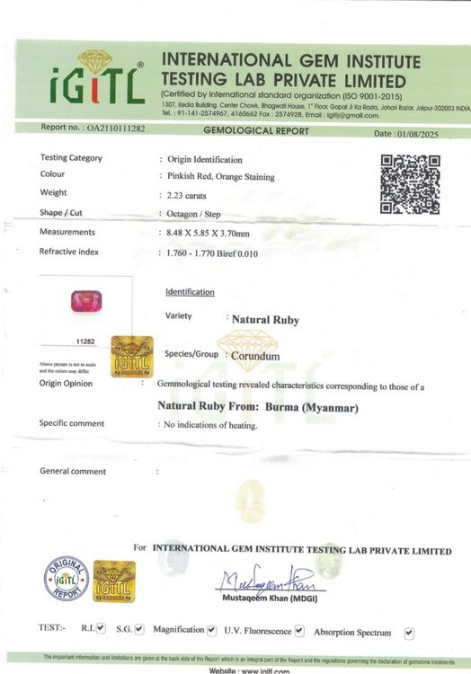 Original Burma Natural Ruby weighing 2.23 Carat (2.48 ratti) From Burma IGITL lab certified