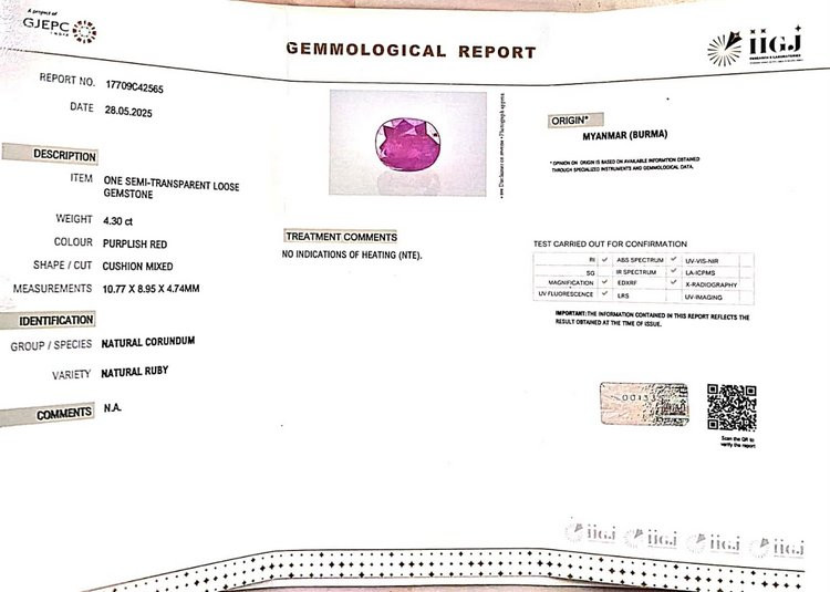 Original Burma Natural Ruby weighing 4.3 Carat (4.78 ratti) From Burma GJEPC lab certified