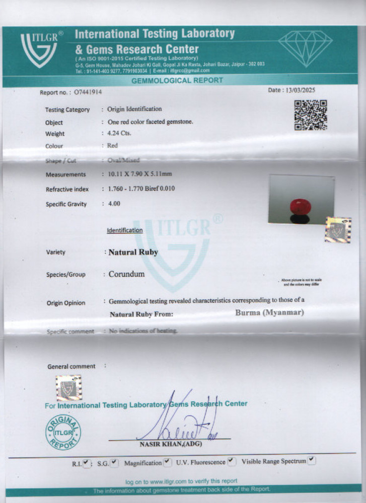 Original Natural Ruby weighing 4.24 Carat (4.71 ratti ) From Burma ITLGR lab certified