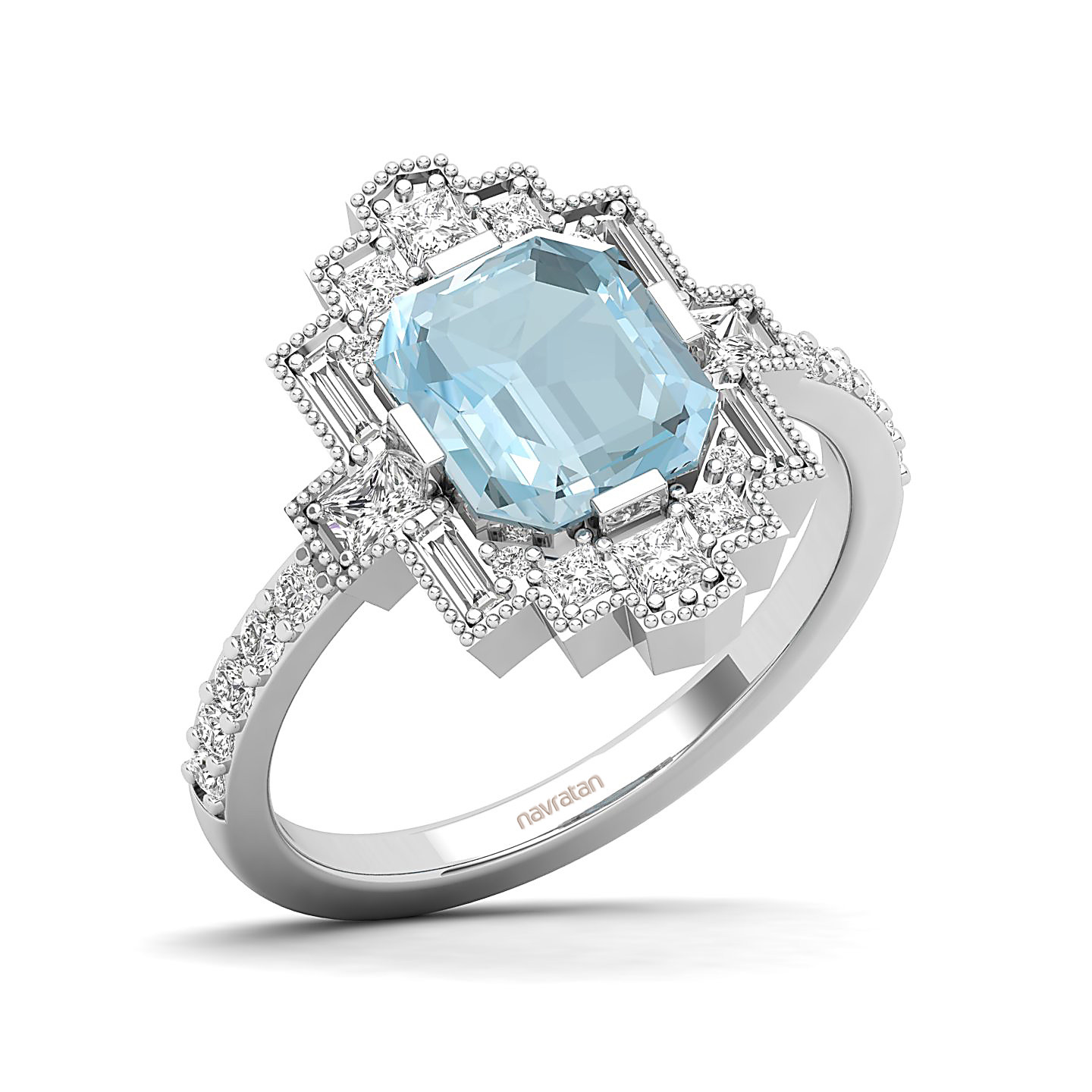 This Cultured Art Deco Aquamarine Ring combines the style of old buildings with modern elegance. The structured design elements make the cool blue gemstone stand out beautifully, showing off both elegance and artistic flair. Perfect for people who like jewelry that shows off creativity, balance, and timeless craftsmanship.