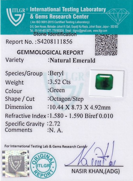 Original Natural Emerald weighing 3.52 Carat (3.91 ratti) From Brazil ITLGR lab certified