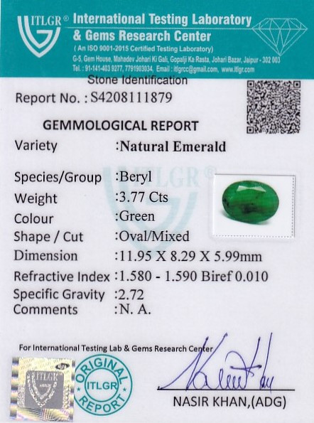 Original Natural Emerald weighing 3.77 Carat (4.19 ratti) From Brazil ITLGR lab certified