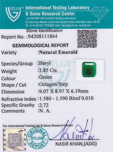 Original Natural Emerald weighing 3.85 Carat (4.28 ratti) From Brazil ITLGR lab certified