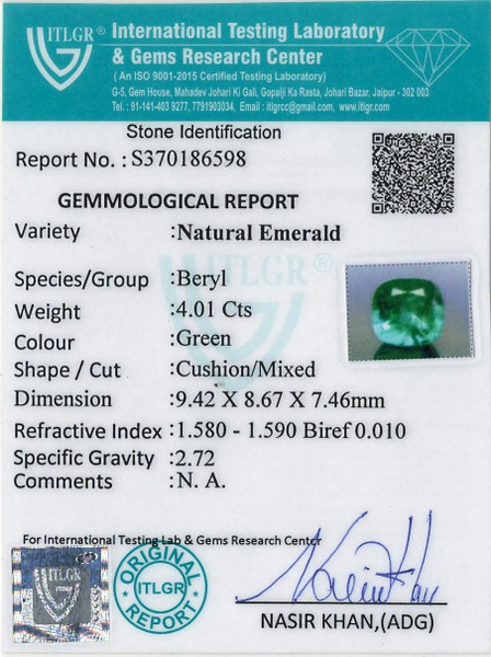 Original Natural Emerald weighing 4.01 Carat (4.46 ratti) From Zambia ITLGR lab certified