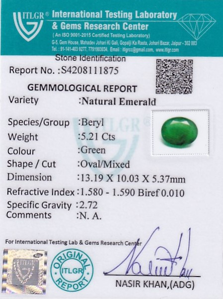 Original Natural Emerald weighing 5.21 Carat (5.79 ratti) From Brazil ITLGR lab certified