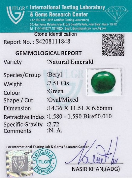 Original Natural Emerald weighing 7.51 Carat (8.34 ratti) From Brazil ITLGR lab certified