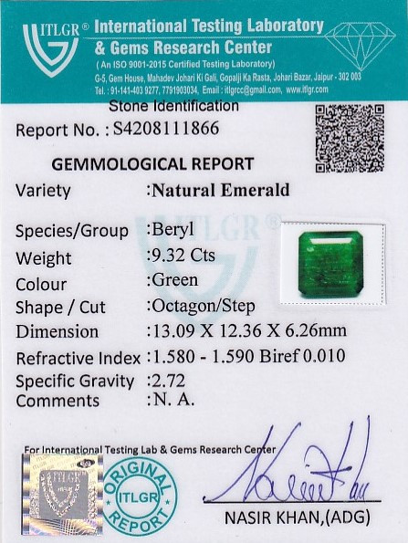 Original Natural Emerald weighing 9.32 Carat (10.36 ratti) From Brazil ITLGR lab certified