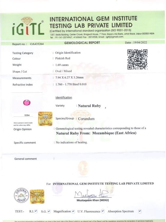 Original Natural Ruby weighing 1.69 Carat (1.88 ratti) From Mozambique IGITL lab certified