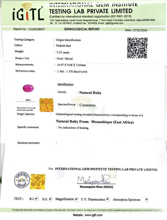 Original Natural Ruby weighing 5.23 Carat (5.81 ratti) From Mozambique IGITL lab certified