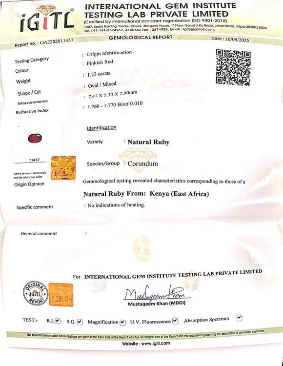 Original Natural Ruby weighing 1.22 Carat (1.36 ratti) From Kenya IGITL lab certified