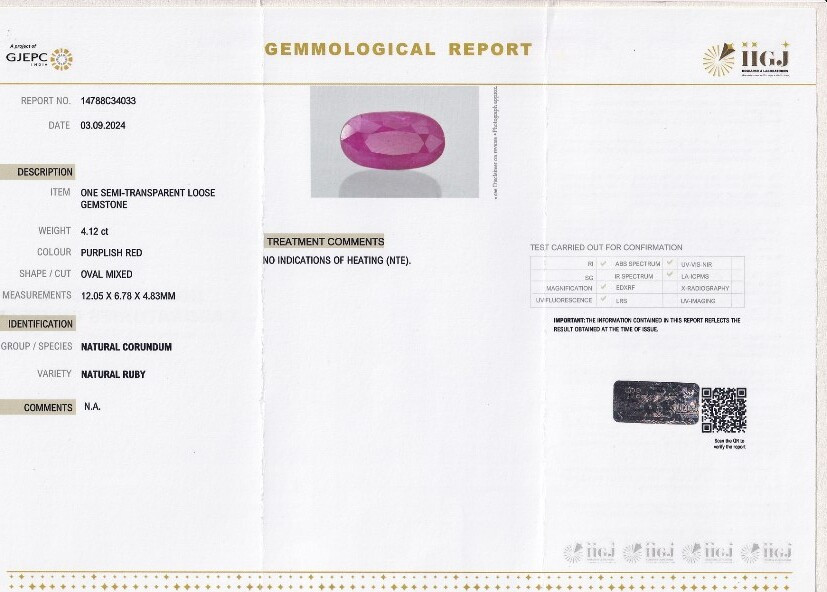 Original Natural Ruby weighing 4.12 Carat (4.58 ratti) From GJEPC lab certified