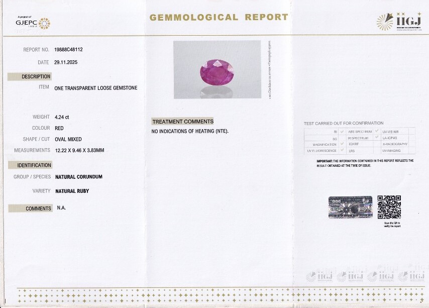 Original Natural Ruby weighing 4.24 Carat (4.71 ratti) From GJEPC lab certified