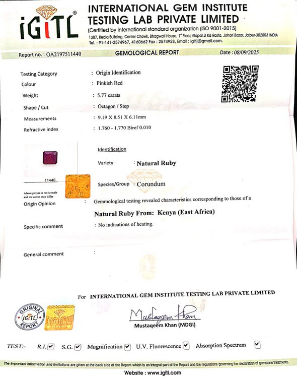 Original Natural Ruby weighing 5.77 Carat (6.41 ratti) From Kenya IGITL lab certified