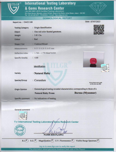 Original Natural Ruby weighing 5.81 Carat (6.46 ratti) From Burma ITLGR lab certified