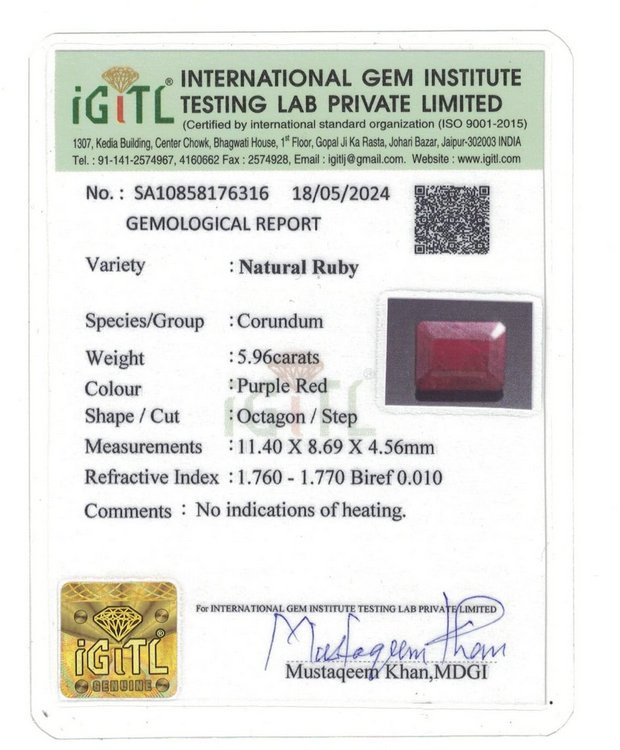 Original Natural Ruby weighing 5.96 Carat (6.62 ratti) From IGITL lab certified