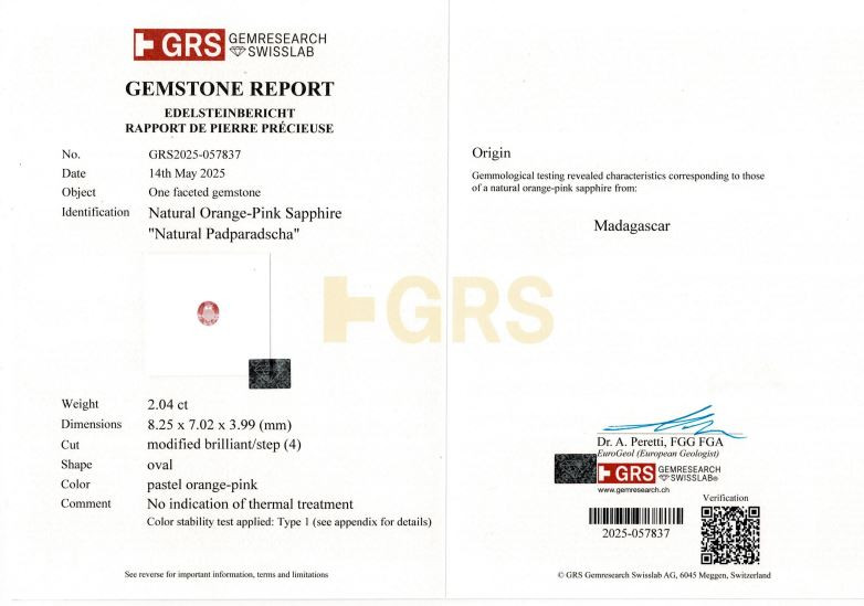 Original Natural Padparadscha Sapphire weighing 2.04 carat (2.27 ratti) From Madagascar GRS lab Certified