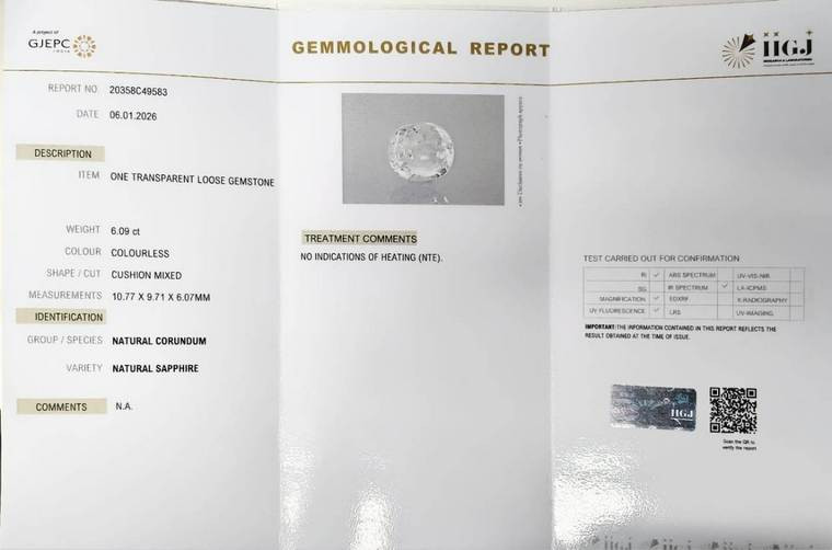 Original Natural White Sapphire weighing 6.09 Carat (6.77 ratti) From Sri Lanka (Ceylon) GJEPC lab certified