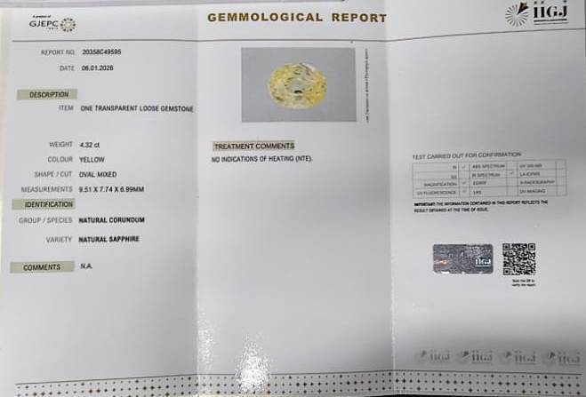 Original Natural Yellow Sapphire weighing 4.32 Carat (4.80 ratti) From Sri Lanka (Ceylon) GJEPC lab certified