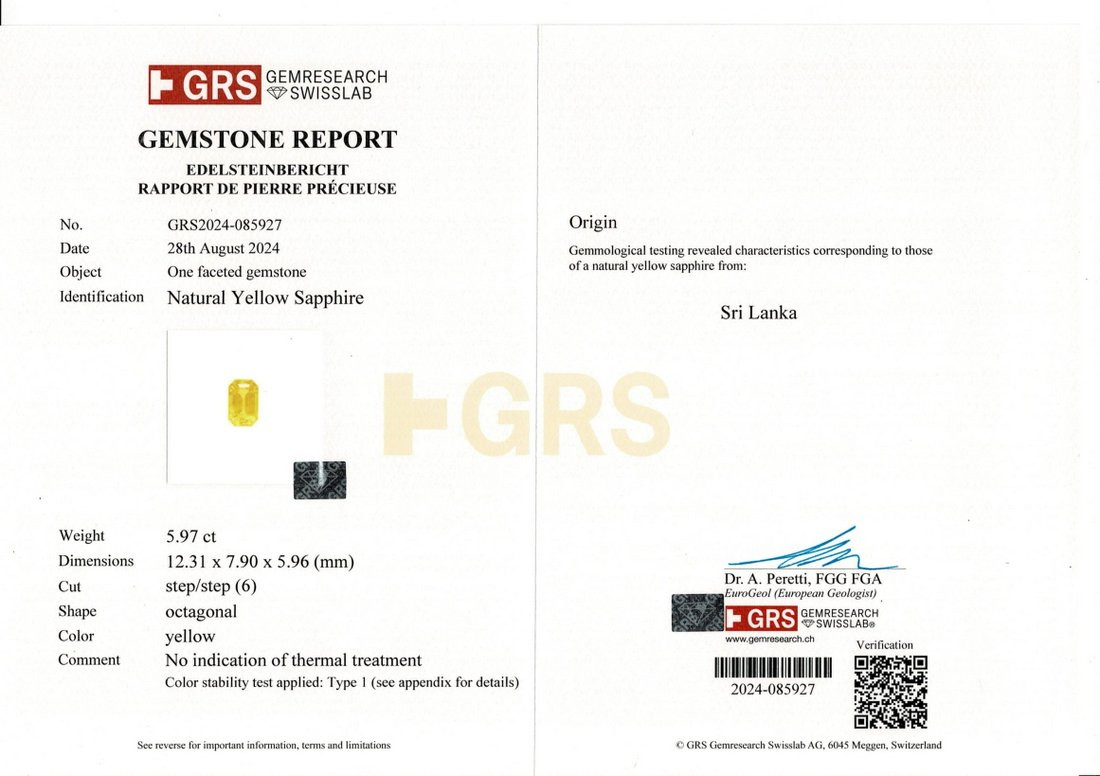 Original Natural Yellow Sapphire weighing 5.97 Carat (6.63) From Sri Lanka (Ceylon) GRS lab certificate