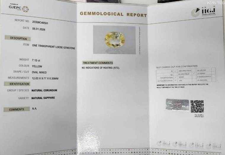 Original Natural Yellow Sapphire weighing 7.13 Carat (7.92 atti) From Sri Lanka (Ceylon) GJEPC lab certified